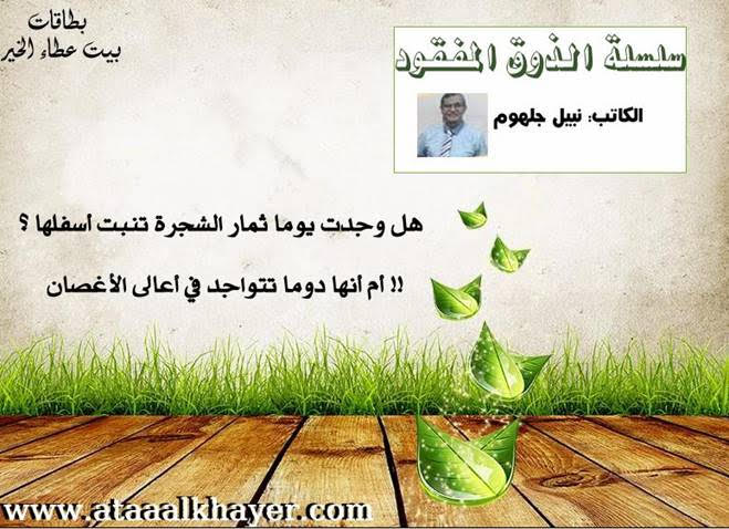 سلسلة الذوق المفقود (24) من:الأخ الأستاذ / نبيل جلهوم عضو جمعية الكُتَّاب ببيت عطاء الخير عضو إتحاد الكتّاب و المثقفين العرب - مصر عضو رابطة أدباء الشام – لندن عضو الإتحاد العالمى للشعراء والمبدعين العرب عضو إتحاد المدربين العرب عضو رابطة الأدب الإسلامى العالمية http://www.ataaalkhayer.com/up/download.php?img=13700 |