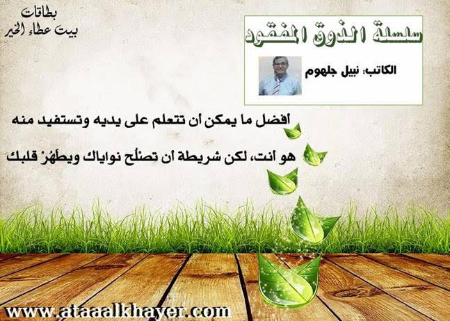 سلسلة الذوق المفقود (25) من:الأخ الأستاذ / نبيل جلهوم عضو جمعية الكُتَّاب ببيت عطاء الخير عضو إتحاد الكتّاب و المثقفين العرب - مصر عضو رابطة أدباء الشام – لندن عضو الإتحاد العالمى للشعراء والمبدعين العرب عضو إتحاد المدربين العرب عضو رابطة الأدب الإسلامى العالمية http://www.ataaalkhayer.com/up/download.php?img=13765 |