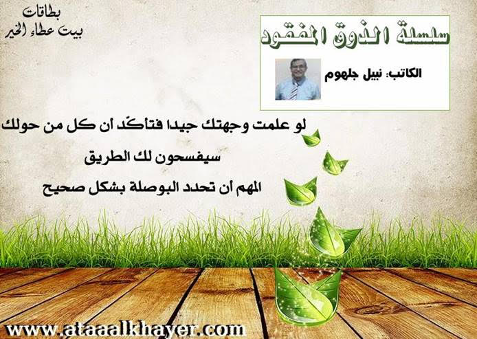 سلسلة الذوق المفقود (29) من:الأخ الأستاذ / نبيل جلهوم عضو جمعية الكُتَّاب ببيت عطاء الخير عضو إتحاد الكتّاب و المثقفين العرب - مصر عضو رابطة أدباء الشام – لندن عضو الإتحاد العالمى للشعراء والمبدعين العرب عضو إتحاد المدربين العرب عضو رابطة الأدب الإسلامى العالمية http://www.ataaalkhayer.com/up/download.php?img=13799 |