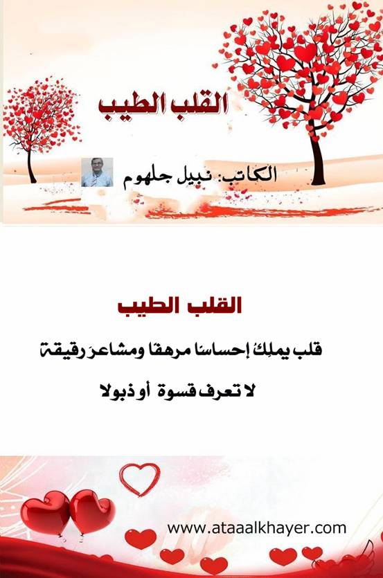 القلب الطيب (11) من:الأخ الأستاذ / نبيل جلهومaa عضو جمعية الكُتَّاب ببيت عطاء الخير عضو إتحاد الكتّاب و المثقفين العرب - مصر عضو رابطة أدباء الشام – لندن عضو الإتحاد العالمى للشعراء والمبدعين العرب عضو إتحاد المدربين العرب عضو رابطة الأدب الإسلامى العالمية http://www.ataaalkhayer.com/up/download.php?img=14189 |
