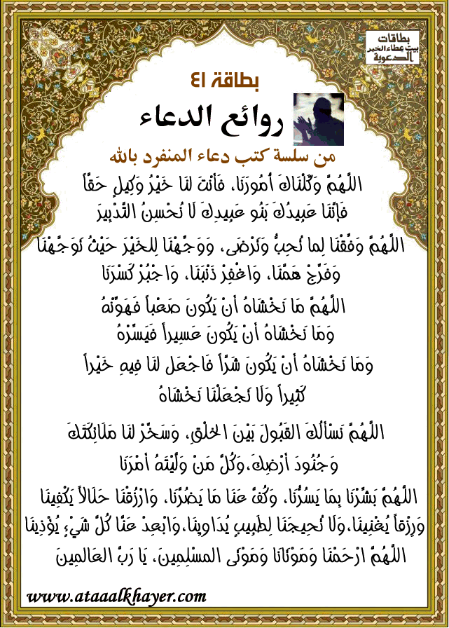 ادع لأخيك بظهر الغيب من سلسة كتب دعاء المنفرد بالله http://www.ataaalkhayer.com/up/download.php?img=9641 روائع الدعاء (41) http://www.ataaalkhayer.com/up/download.php?img=14344 |