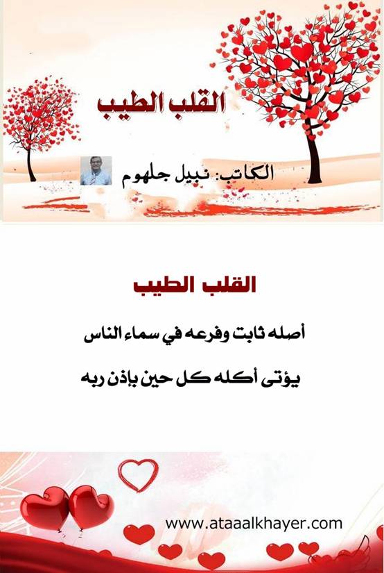القلب الطيب (37) من:الأخ الأستاذ / نبيل جلهوم عضو جمعية الكُتَّاب ببيت عطاء الخير عضو إتحاد الكتّاب و المثقفين العرب - مصر عضو رابطة أدباء الشام – لندن عضو الإتحاد العالمى للشعراء والمبدعين العرب عضو إتحاد المدربين العرب عضو رابطة الأدب الإسلامى العالمية http://www.ataaalkhayer.com/up/download.php?img=14365 |