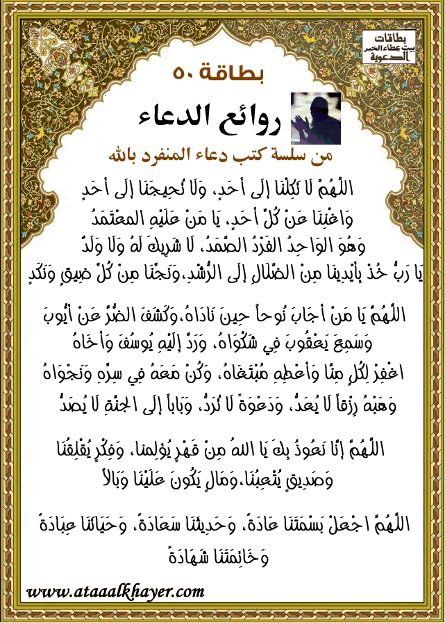 ادع لأخيك بظهر الغيب من سلسة كتب دعاء المنفرد بالله http://www.ataaalkhayer.com/up/download.php?img=9641 روائع الدعاء (50) http://www.ataaalkhayer.com/up/download.php?img=14400 |