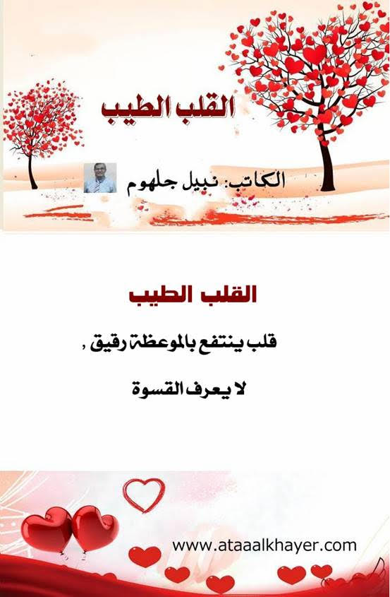 القلب الطيب (49) من:الأخ الأستاذ / نبيل جلهوم عضو جمعية الكُتَّاب ببيت عطاء الخير عضو إتحاد الكتّاب و المثقفين العرب - مصر عضو رابطة أدباء الشام – لندن عضو الإتحاد العالمى للشعراء والمبدعين العرب عضو إتحاد المدربين العرب عضو رابطة الأدب الإسلامى العالمية http://www.ataaalkhayer.com/up/download.php?img=14458 |