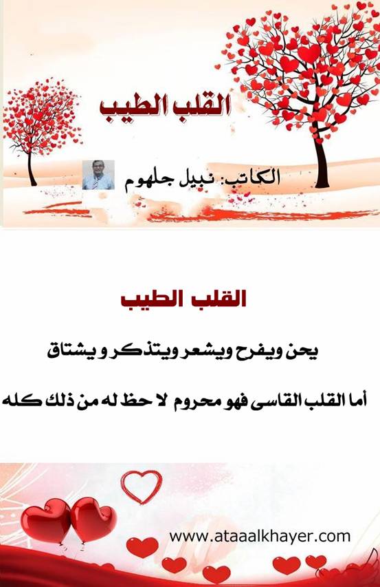 القلب الطيب (58) من:الأخ الأستاذ / نبيل جلهوم عضو جمعية الكُتَّاب ببيت عطاء الخير عضو إتحاد الكتّاب و المثقفين العرب - مصر عضو رابطة أدباء الشام – لندن عضو الإتحاد العالمى للشعراء والمبدعين العرب عضو إتحاد المدربين العرب عضو رابطة الأدب الإسلامى العالمية http://www.ataaalkhayer.com/up/download.php?img=14514 |