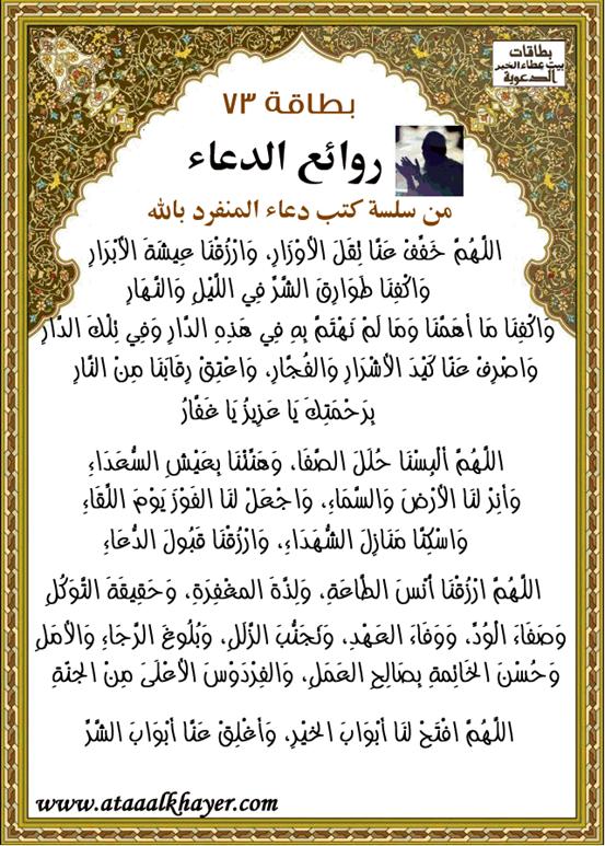 ادع لأخيك بظهر الغيب من سلسة كتب دعاء المنفرد بالله http://www.ataaalkhayer.com/up/download.php?img=9641 روائع الدعاء (74) http://www.ataaalkhayer.com/up/download.php?img=14634 |