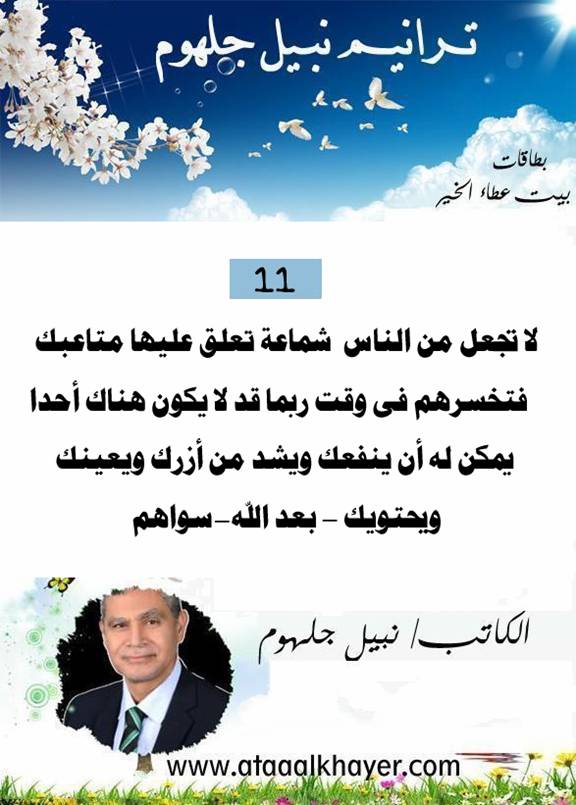 ترانيم نبيل جلهوم (11) من:الأخ الأستاذ / نبيل جلهوم عضو جمعية الكُتَّاب ببيت عطاء الخير عضو إتحاد الكتّاب و المثقفين العرب - مصر عضو رابطة أدباء الشام – لندن عضو الإتحاد العالمى للشعراء والمبدعين العرب عضو إتحاد المدربين العرب عضو رابطة الأدب الإسلامى العالمية http://www.ataaalkhayer.com/up/download.php?img=14661 |