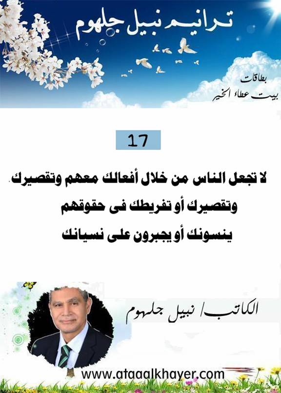 ترانيم نبيل جلهوم (17) من:الأخ الأستاذ / نبيل جلهوم عضو جمعية الكُتَّاب ببيت عطاء الخير عضو إتحاد الكتّاب و المثقفين العرب - مصر عضو رابطة أدباء الشام – لندن عضو الإتحاد العالمى للشعراء والمبدعين العرب عضو إتحاد المدربين العرب عضو رابطة الأدب الإسلامى العالمية http://www.ataaalkhayer.com/up/download.php?img=14734 |
