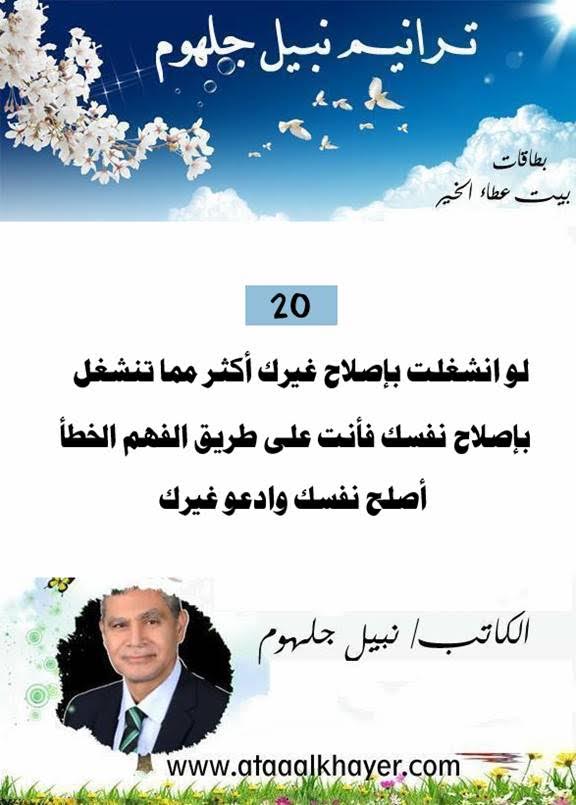 ترانيم نبيل جلهوم (20) من:الأخ الأستاذ / نبيل جلهوم عضو جمعية الكُتَّاب ببيت عطاء الخير عضو إتحاد الكتّاب و المثقفين العرب - مصر عضو رابطة أدباء الشام – لندن عضو الإتحاد العالمى للشعراء والمبدعين العرب عضو إتحاد المدربين العرب عضو رابطة الأدب الإسلامى العالمية http://www.ataaalkhayer.com/up/download.php?img=14752 |