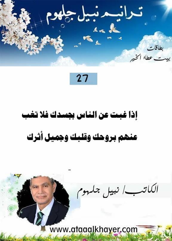 ترانيم نبيل جلهوم (27) من:الأخ الأستاذ / نبيل جلهوم عضو جمعية الكُتَّاب ببيت عطاء الخير عضو إتحاد الكتّاب و المثقفين العرب - مصر عضو رابطة أدباء الشام – لندن عضو الإتحاد العالمى للشعراء والمبدعين العرب عضو إتحاد المدربين العرب عضو رابطة الأدب الإسلامى العالمية http://www.ataaalkhayer.com/up/download.php?img=14795 |