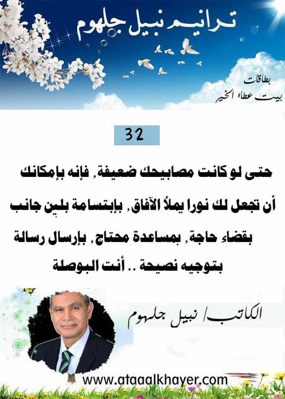 ترانيم نبيل جلهوم (32) من:الأخ الأستاذ / نبيل جلهوم عضو جمعية الكُتَّاب ببيت عطاء الخير عضو إتحاد الكتّاب و المثقفين العرب - مصر عضو رابطة أدباء الشام – لندن عضو الإتحاد العالمى للشعراء والمبدعين العرب عضو إتحاد المدربين العرب عضو رابطة الأدب الإسلامى العالمية http://www.ataaalkhayer.com/up/download.php?img=14825 |