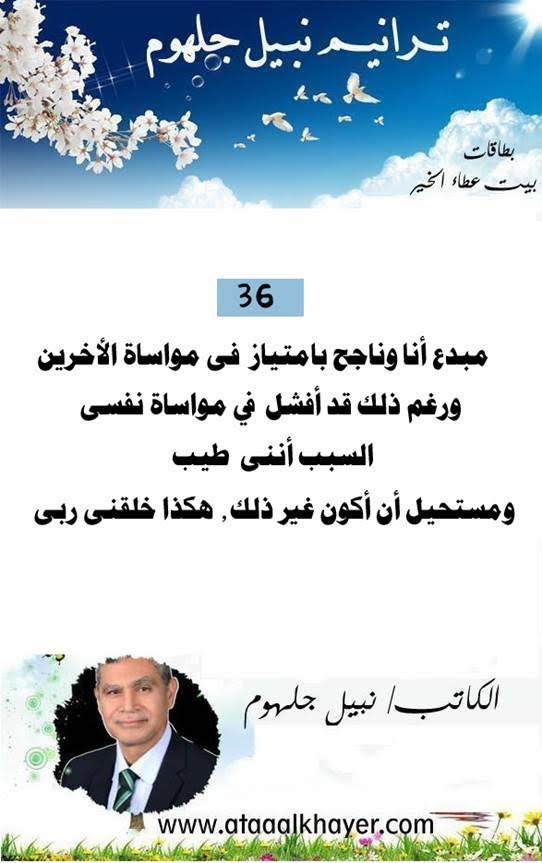 ترانيم نبيل جلهوم (36) من:الأخ الأستاذ / نبيل جلهوم عضو جمعية الكُتَّاب ببيت عطاء الخير عضو إتحاد الكتّاب و المثقفين العرب - مصر عضو رابطة أدباء الشام – لندن عضو الإتحاد العالمى للشعراء والمبدعين العرب عضو إتحاد المدربين العرب عضو رابطة الأدب الإسلامى العالمية http://www.ataaalkhayer.com/up/download.php?img=14899 |