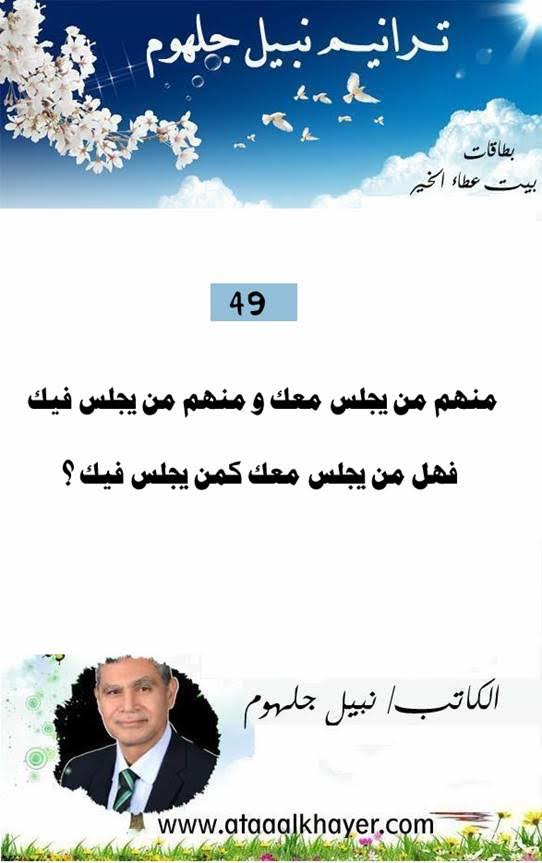 ترانيم نبيل جلهوم (49) من:الأخ الأستاذ / نبيل جلهوم عضو جمعية الكُتَّاب ببيت عطاء الخير عضو إتحاد الكتّاب و المثقفين العرب - مصر عضو رابطة أدباء الشام – لندن عضو الإتحاد العالمى للشعراء والمبدعين العرب عضو إتحاد المدربين العرب عضو رابطة الأدب الإسلامى العالمية http://www.ataaalkhayer.com/up/download.php?img=14975 |