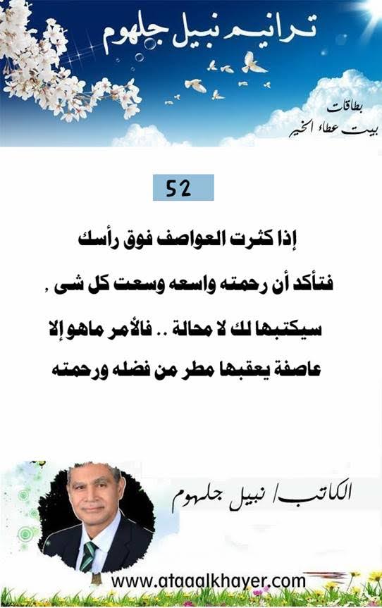 ترانيم نبيل جلهوم (52) من:الأخ الأستاذ / نبيل جلهوم عضو جمعية الكُتَّاب ببيت عطاء الخير عضو إتحاد الكتّاب و المثقفين العرب - مصر عضو رابطة أدباء الشام – لندن عضو الإتحاد العالمى للشعراء والمبدعين العرب عضو إتحاد المدربين العرب عضو رابطة الأدب الإسلامى العالمية http://www.ataaalkhayer.com/up/download.php?img=14991 |