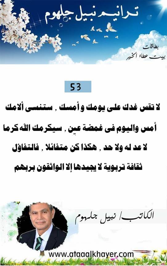 ترانيم نبيل جلهوم (53) من:الأخ الأستاذ / نبيل جلهوم عضو جمعية الكُتَّاب ببيت عطاء الخير عضو إتحاد الكتّاب و المثقفين العرب - مصر عضو رابطة أدباء الشام – لندن عضو الإتحاد العالمى للشعراء والمبدعين العرب عضو إتحاد المدربين العرب عضو رابطة الأدب الإسلامى العالمية http://www.ataaalkhayer.com/up/download.php?img=14995 |