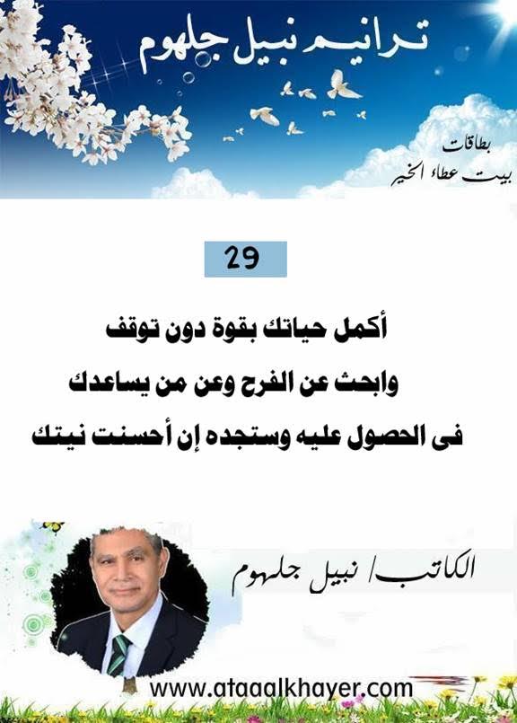 ترانيم نبيل جلهوم (29) من:الأخ الأستاذ / نبيل جلهوم عضو جمعية الكُتَّاب ببيت عطاء الخير عضو إتحاد الكتّاب و المثقفين العرب - مصر عضو رابطة أدباء الشام – لندن عضو الإتحاد العالمى للشعراء والمبدعين العرب عضو إتحاد المدربين العرب عضو رابطة الأدب الإسلامى العالمية http://www.ataaalkhayer.com/up/download.php?img=14807 |