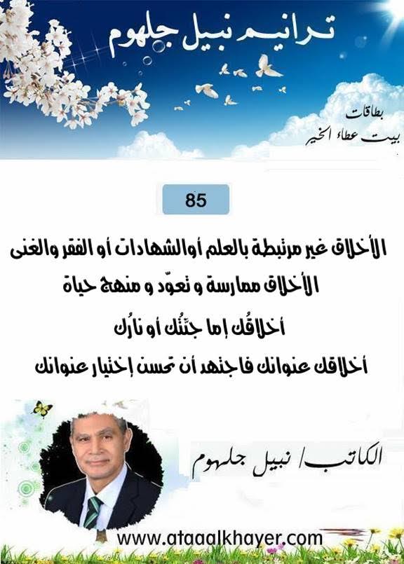 ترانيم نبيل جلهوم (85) من:الأخ الأستاذ / نبيل جلهوم عضو جمعية الكُتَّاب ببيت عطاء الخير عضو إتحاد الكتّاب و المثقفين العرب - مصر عضو رابطة أدباء الشام – لندن عضو الإتحاد العالمى للشعراء والمبدعين العرب عضو إتحاد المدربين العرب عضو رابطة الأدب الإسلامى العالمية http://www.ataaalkhayer.com/up/download.php?img=15228 |