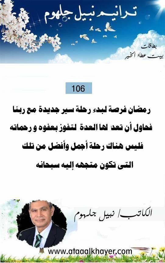 ترانيم نبيل جلهوم (106) من:الأخ الأستاذ / نبيل جلهوم عضو جمعية الكُتَّاب ببيت عطاء الخير عضو إتحاد الكتّاب و المثقفين العرب - مصر عضو رابطة أدباء الشام – لندن عضو الإتحاد العالمى للشعراء والمبدعين العرب عضو إتحاد المدربين العرب عضو رابطة الأدب الإسلامى العالمية http://www.ataaalkhayer.com/up/download.php?img=15331 |