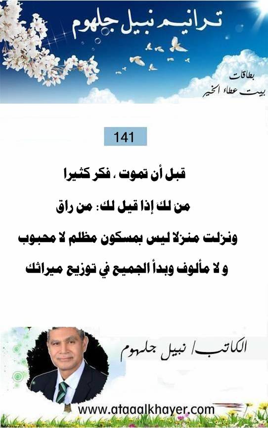 ترانيم نبيل جلهوم (141) من:الأخ الأستاذ / نبيل جلهوم عضو جمعية الكُتَّاب ببيت عطاء الخير عضو إتحاد الكتّاب و المثقفين العرب - مصر عضو رابطة أدباء الشام – لندن عضو الإتحاد العالمى للشعراء والمبدعين العرب عضو إتحاد المدربين العرب عضو رابطة الأدب الإسلامى العالمية http://www.ataaalkhayer.com/up/download.php?img=15607 |