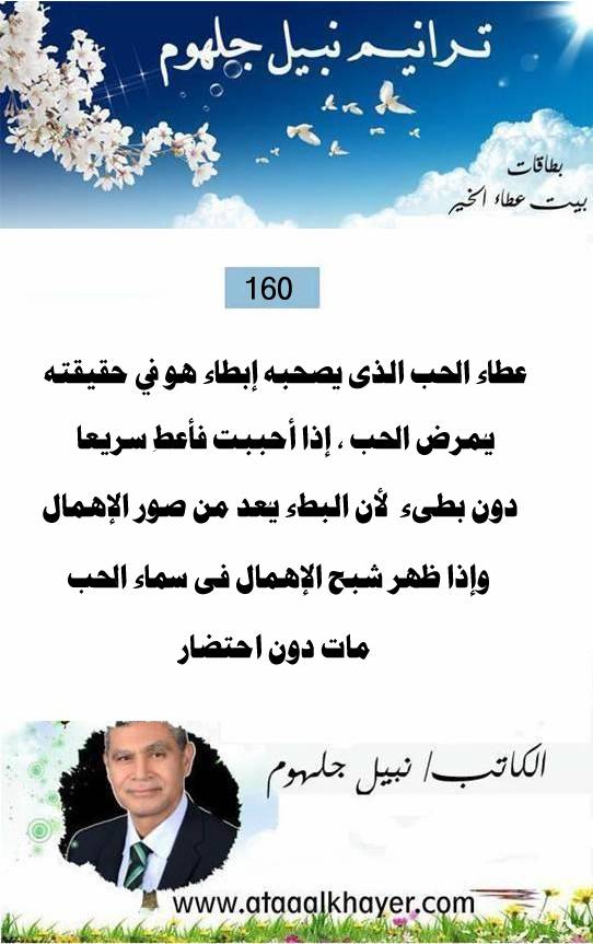 ترانيم نبيل جلهوم (160) من:الأخ الأستاذ / نبيل جلهوم عضو جمعية الكُتَّاب ببيت عطاء الخير عضو إتحاد الكتّاب و المثقفين العرب - مصر عضو رابطة أدباء الشام – لندن عضو الإتحاد العالمى للشعراء والمبدعين العرب عضو إتحاد المدربين العرب عضو رابطة الأدب الإسلامى العالمية http://www.ataaalkhayer.com/up/download.php?img=15702 |