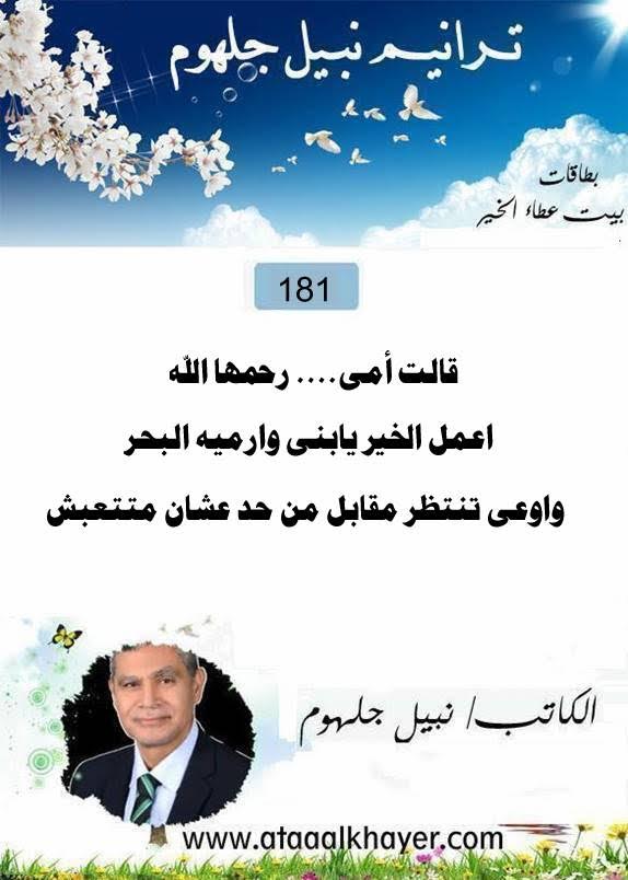 ترانيم نبيل جلهوم(181) من:الأخ الأستاذ / نبيل جلهوم عضو جمعية الكُتَّاب ببيت عطاء الخير عضو إتحاد الكتّاب و المثقفين العرب - مصر عضو رابطة أدباء الشام – لندن عضو الإتحاد العالمى للشعراء والمبدعين العرب عضو إتحاد المدربين العرب عضو رابطة الأدب الإسلامى العالمية http://www.ataaalkhayer.com/up/download.php?img=15781 |