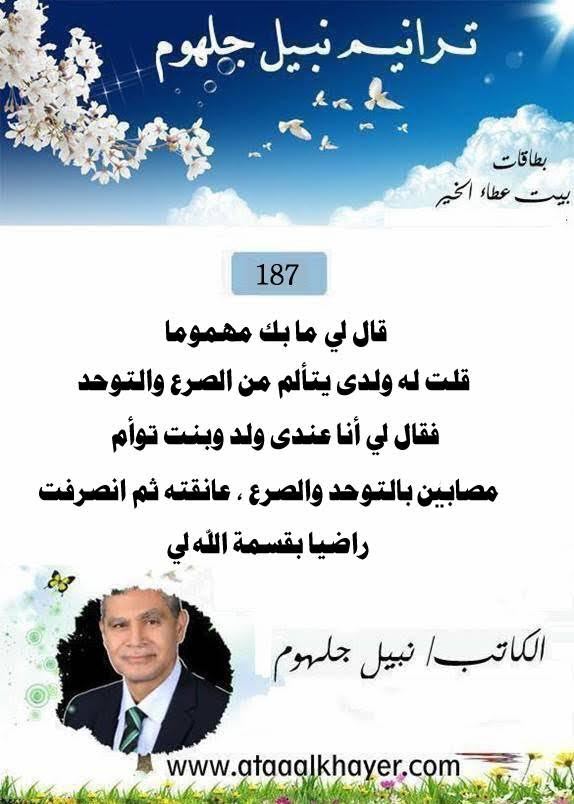 ترانيم نبيل جلهوم(187) من:الأخ الأستاذ / نبيل جلهوم عضو جمعية الكُتَّاب ببيت عطاء الخير عضو إتحاد الكتّاب و المثقفين العرب - مصر عضو رابطة أدباء الشام – لندن عضو الإتحاد العالمى للشعراء والمبدعين العرب عضو إتحاد المدربين العرب عضو رابطة الأدب الإسلامى العالمية http://www.ataaalkhayer.com/up/download.php?img=15845 |