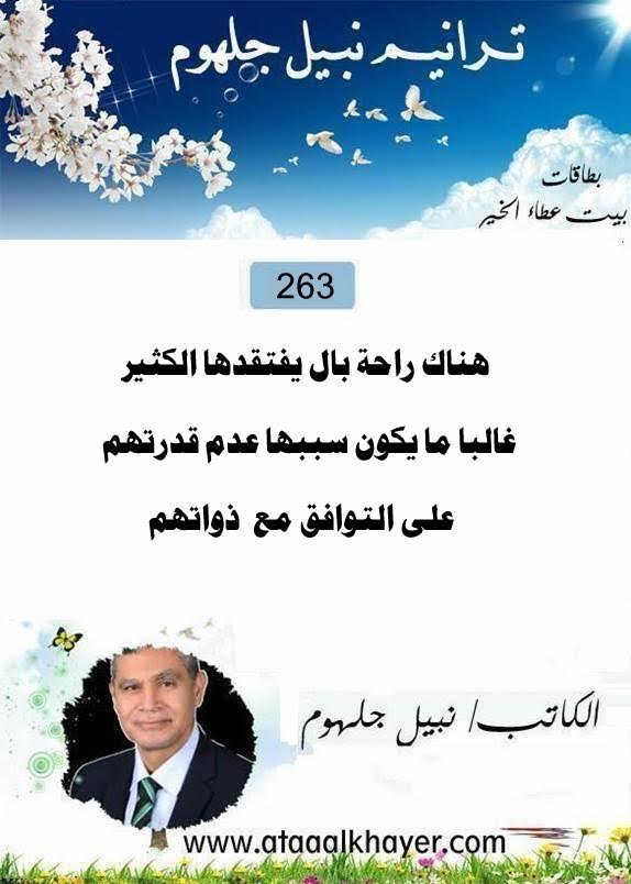 ترانيم نبيل جلهوم(263) من:الأخ الأستاذ / نبيل جلهوم عضو جمعية الكُتَّاب ببيت عطاء الخير عضو إتحاد الكتّاب و المثقفين العرب - مصر عضو رابطة أدباء الشام – لندن عضو الإتحاد العالمى للشعراء والمبدعين العرب عضو إتحاد المدربين العرب عضو رابطة الأدب الإسلامى العالمية http://www.ataaalkhayer.com/up/download.php?img=16121 |