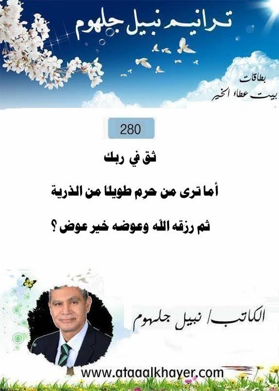 ترانيم نبيل جلهوم(280) من:الأخ الأستاذ / نبيل جلهوم عضو جمعية الكُتَّاب ببيت عطاء الخير عضو إتحاد الكتّاب و المثقفين العرب - مصر عضو رابطة أدباء الشام – لندن عضو الإتحاد العالمى للشعراء والمبدعين العرب عضو إتحاد المدربين العرب عضو رابطة الأدب الإسلامى العالمية http://www.ataaalkhayer.com/up/download.php?img=16172 |
