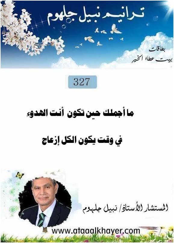 ترانيم نبيل جلهوم(327) من:الأخ الأستاذ / نبيل جلهوم عضو جمعية الكُتَّاب ببيت عطاء الخير عضو إتحاد الكتّاب و المثقفين العرب - مصر عضو رابطة أدباء الشام – لندن عضو الإتحاد العالمى للشعراء والمبدعين العرب عضو إتحاد المدربين العرب عضو رابطة الأدب الإسلامى العالمية http://www.ataaalkhayer.com/up/download.php?img=16314 |
