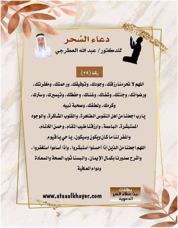 من الأخ الدكتور / عبدالله بن مراد العطرجي عضو جمعية الكُتَّاب ببيت عطاء الخير دعاء السحر (29) http://www.ataaalkhayer.com/up/download.php?img=17408 |