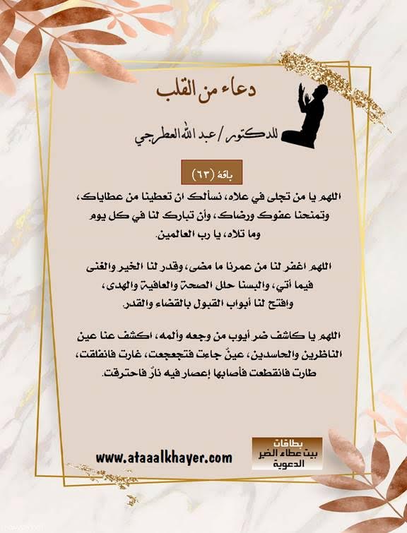 من الأخ الدكتور / عبدالله بن مراد العطرجي عضو جمعية الكُتَّاب ببيت عطاء الخير دعاء من القلب (63) http://www.ataaalkhayer.com/up/download.php?img=18090 |