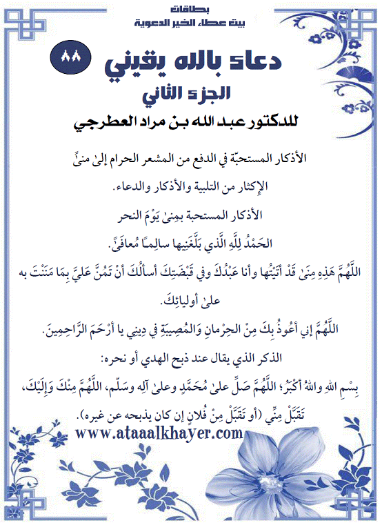 من الأخ الدكتور / عبدالله بن مراد العطرجي عضو جمعية الكُتَّاب ببيت عطاء الخير دعاء بالله يقيني - الجزء الثاني (88) http://www.ataaalkhayer.com/up/download.php?img=19146 |