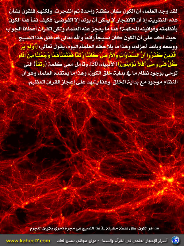 الأخ المهندس الدكتور / عبدالدائم الكحيل صورة و آية : السماء والأرض كانتا رتقاً http://www.ataaalkhayer.com/up/download.php?img=964 اكتشف العلماء أن جميع المجرات والنجوم كانت نسيجاً متماسكاً ثم تفككت وانتشرت وتباعدت في رحاب هذا الكون.... http://www.ataaalkhayer.com/up/download.php?img=965 -------------- بقلم المهندس / عبد الدائم الكحيل |