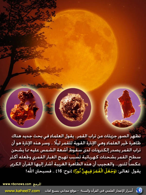 من:الأخ المهندس / عبدالدائم الكحيل http://www.ataaalkhayer.com/up/download.php?img=9641 سر إنارة القمر تراب القمر يختلف عن تراب الأرض حيث يؤدي سقوط أشعة الشمس عليه لإطلاق إلكترونات وخلق جو مشحون كهربائياً .... http://www.ataaalkhayer.com/up/download.php?img=21862 |