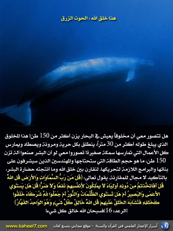من:الأخ المهندس / عبدالدائم الكحيل http://www.ataaalkhayer.com/up/download.php?img=9641 الحوت الأزرق إنه مخلوق ضخم جداً يعتبر أكبر مخلوق على الأرض، إنه الحوت الأزرق الذي يصل وزنه لأكثر من 150000 كيلو غرام… لنتأمل ونسبح الله تعالى… http://www.ataaalkhayer.com/up/download.php?img=21879 |