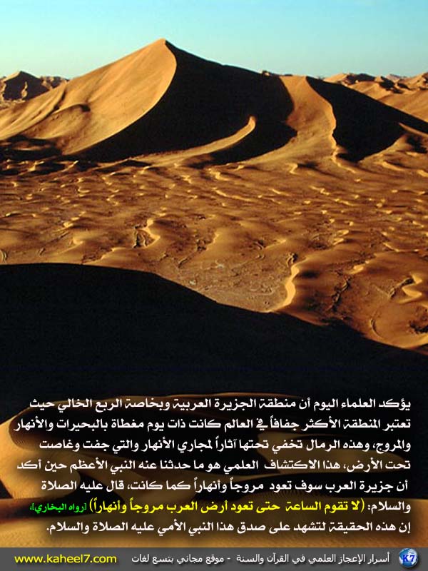 من:الأخ المهندس / عبدالدائم الكحيل صحراء منطقة الجزيرة العربية ! عن أبي هريرة رضي الله عنه ، أن رسول الله -صلى الله عليه وسلم- قال: (لا تقوم الساعة حتى يكثر المال ويفيض، حتى يخرج الرجل بزكاة ماله فلا يجد أحدا يقبلها منه، وحتى تعود أرض العرب مروجا وأنهارا) رواه مسلم http://www.ataaalkhayer.com/up/download.php?img=21901 |