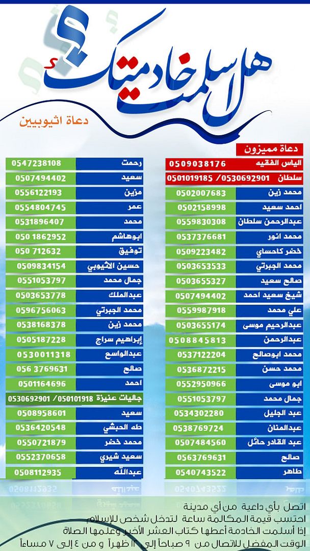 مشروع هل أسلمت خادمتك أرقام 45 داعية أثيوبي في مشروع هل أسلمت خادمتك وجميعهم ينتظرون اتصالك إذا لديك خادمه أثيوبيه أو عامل أثيوبي هذه أرقام مايقارب 45 داعية كلهم ينتظرون إتصالك فقط اتصل بالداعية بجوالك وأعط الجوال للخادمة أو العامل ليشرح لهم ويدعوهم للإسلام فتفوز بأجر هدايتهم http://i769.photobucket.com/albums/x...jpg%7Eoriginal أنشر فلاتدري ربما يسلم على يديك اناس كثير وانت لاتدري فساعدنا في نشر هذه الموضوع بارك الله فيكم الموضوع مهم جدا أرجو المساعدة في نشره ورفعه جزاكم الله خير من يريد باقي اللغات فليتفضل https://pbs.twimg.com/media/A9GJ_SzCIAEyjDP.jpg وهنا أرقام دعاة صينيين فإذا تعرف خادمة أو عامل صيني غير مسلم اتصل بهم http://i769.photobucket.com/albums/x...A064A06460.jpg هذه أرقام مجموعة من الدعاة الصينيين اتصل عليهم بجوالك ثم أعط الجوال للعامل أو الخادمة ليكلمهم ويدعوهم الى الله فلعل الله يهديهم فتفوز بخيري الدنيا والآخرة الداعية الصيني موسى / 0507939153 الداعية الصيني سليمان / 0552464228 الداعية الصيني عيسى / 0559575339 الداعية الصيني عبدالحكيم / 0532822199 الداعية الصيني إسماعيل / 0532263511 جاليات النسيم مركز دعوة الصينيين جوال / 0534114444 جاليات النسيم مركز دعوة الصينيين ثابت / 012270607 وهذا هو موقع المكتب التعاوني للدعوة والإرشاد ودعوة الجاليات بالنسيم وهو أول مركز متخصص في دعوة الصينيين في العالم العربي www.callingchinese.org ساعدونا في نشر الموضوع في المنتديات والأيميلات والقروبات فالدال على الخير كفاعله فلا تفوت هذه الغنيمة الباردة وتاجر مع الله هيفولا:o |