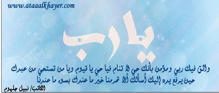 اللهم أسألك ألا تحرمنا خير ما عندك الأخ الأستاذ / نبيل جلهوم عضو جمعية الكُتَّاب ببيت عطاء الخير عضو إتحاد الكتّاب و المثقفين العرب - مصر عضو رابطة أدباء الشام – لندن عضو الإتحاد العالمى للشعراء والمبدعين العرب http://www.ataaalkhayer.com/up/download.php?img=5064 |