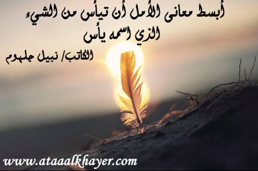 أبسط معاني الأمل الأخ الأستاذ / نبيل جلهوم عضو جمعية الكُتَّاب ببيت عطاء الخير عضو إتحاد الكتّاب و المثقفين العرب - مصر عضو رابطة أدباء الشام – لندن عضو الإتحاد العالمى للشعراء والمبدعين العرب http://www.ataaalkhayer.com/up/download.php?img=6101 |