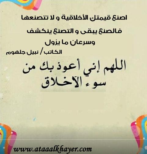 اصنع قيمتك الأخلاقية الأخ الأستاذ / نبيل جلهوم عضو جمعية الكُتَّاب ببيت عطاء الخير عضو إتحاد الكتّاب و المثقفين العرب - مصر عضو رابطة أدباء الشام – لندن عضو الإتحاد العالمى للشعراء والمبدعين العرب http://www.ataaalkhayer.com/up/download.php?img=6393 |