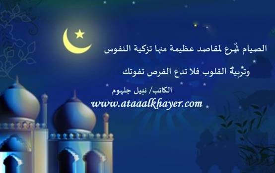 مقاصد الصيام العظيمة الأخ الأستاذ / نبيل جلهوم عضو جمعية الكُتَّاب ببيت عطاء الخير عضو إتحاد الكتّاب و المثقفين العرب - مصر عضو رابطة أدباء الشام – لندن عضو الإتحاد العالمى للشعراء والمبدعين العرب عضو إتحاد المدربين العرب عضو رابطة الأدب الإسلامى العالمية http://www.ataaalkhayer.com/up/download.php?img=6666 |