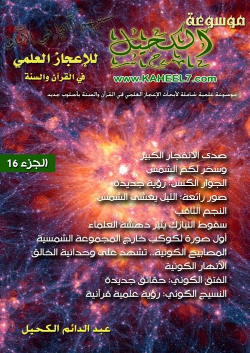 من:الأخ المهندس / عبدالدائم الكحيل موسوعة الكحيل للإعجاز العلمي 16 سوف نرى صوراً رائعة لليل وهو يغشى الشمس وحديث القرآن عن هذه الصورة.. كذلك نتناول حقيقة النجوم النيوترونية (النجم الثاقب).. وحقائق عديدة أخرى.... بفضل لله تعالى تم إنجاز الجزء السادس عشر ونخصصه لعلم الفلك ونتناول العديد من الحقائق الكونية ونبدأ بصدى الانفجار الكبير ودلالاته في القرآن الكريم وكذلك نتناول رؤية جديدة لقوله تعالى: { وَسَخَّر لَكُمُ الشَّمْسَ } . كما نتناول حقيقة الثقوب السوداء وهي التي سماها القرآن بالجوار الكنس من خلال رؤية رؤية جديدة. سوف نرى صوراً رائعة لليل وهو يغشى الشمس وحديث القرآن عن هذه الصورة.. كذلك نتناول حقيقة النجوم النيوترونية (النجم الثاقب).. وحقائق عديدة أخرى: سقوط النيازك يثير دهشة العلماء - أول صورة لكوكب خارج المجموعة الشمسية - المصابيح الكونية.. تشهد على وحدانية الخالق - الأنهار الكونية - الفتق الكوني: حقائق جديدة وأخيراً نتناول حقيقة النسيج الكوني وكيف أنبأ القرآن الكريم عن هذه الحقيقة الكونية.. لتحميل الكتاب على ملف بي دي إف 1.7 ميغا http://www.ataaalkhayer.com/up/download.php?img=3299 بقلم المهندس/ عبد الدائم الكحيل |