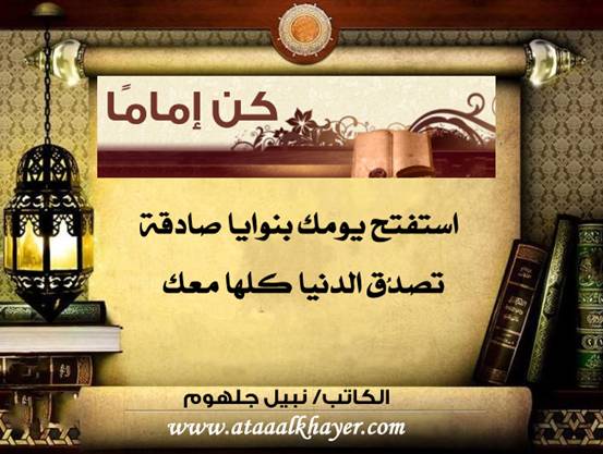 كن إماماً (3) من:الأخ الأستاذ / نبيل جلهوم عضو جمعية الكُتَّاب ببيت عطاء الخير عضو إتحاد الكتّاب و المثقفين العرب - مصر عضو رابطة أدباء الشام – لندن عضو الإتحاد العالمى للشعراء والمبدعين العرب عضو إتحاد المدربين العرب عضو رابطة الأدب الإسلامى العالمية http://www.ataaalkhayer.com/up/download.php?img=7010 |