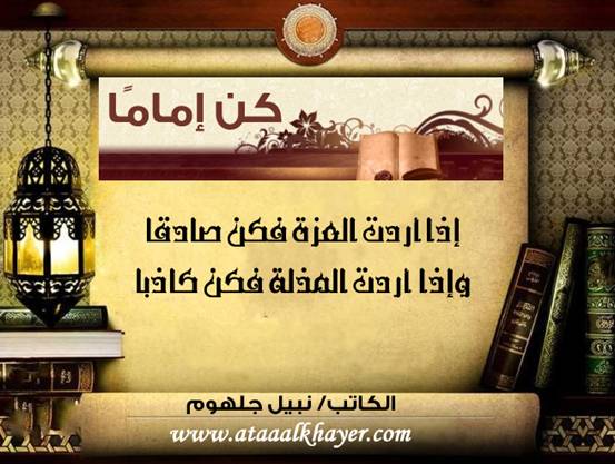 كن إماماً (16) من:الأخ الأستاذ / نبيل جلهوم عضو جمعية الكُتَّاب ببيت عطاء الخير عضو إتحاد الكتّاب و المثقفين العرب - مصر عضو رابطة أدباء الشام – لندن عضو الإتحاد العالمى للشعراء والمبدعين العرب عضو إتحاد المدربين العرب عضو رابطة الأدب الإسلامى العالمية http://www.ataaalkhayer.com/up/download.php?img=7193 |