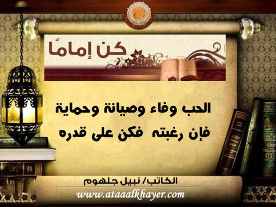 كن إماماً (23) من:الأخ الأستاذ / نبيل جلهوم عضو جمعية الكُتَّاب ببيت عطاء الخير عضو إتحاد الكتّاب و المثقفين العرب - مصر عضو رابطة أدباء الشام – لندن عضو الإتحاد العالمى للشعراء والمبدعين العرب عضو إتحاد المدربين العرب عضو رابطة الأدب الإسلامى العالمية http://www.ataaalkhayer.com/up/download.php?img=7308 |