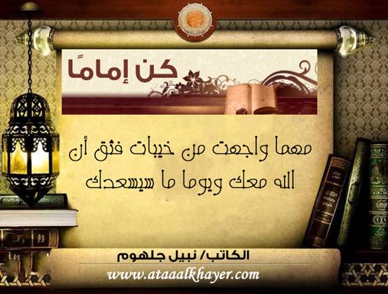 كن إماماً (27) من:الأخ الأستاذ / نبيل جلهوم عضو جمعية الكُتَّاب ببيت عطاء الخير عضو إتحاد الكتّاب و المثقفين العرب - مصر عضو رابطة أدباء الشام – لندن عضو الإتحاد العالمى للشعراء والمبدعين العرب عضو إتحاد المدربين العرب عضو رابطة الأدب الإسلامى العالمية http://www.ataaalkhayer.com/up/download.php?img=7359 |