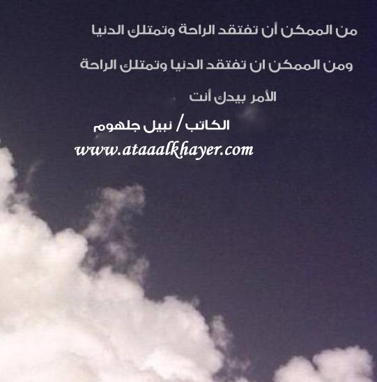 الأمر بيدك أنت شمن:الأخ الأستاذ / نبيل جلهوم عضو جمعية الكُتَّاب ببيت عطاء الخير عضو إتحاد الكتّاب و المثقفين العرب - مصر عضو رابطة أدباء الشام – لندن عضو الإتحاد العالمى للشعراء والمبدعين العرب عضو إتحاد المدربين العرب عضو رابطة الأدب الإسلامى العالمية http://www.ataaalkhayer.com/up/download.php?img=7584 |