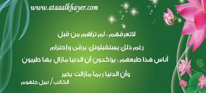 الدنيا بخير من:الأخ الأستاذ / نبيل جلهوم عضو جمعية الكُتَّاب ببيت عطاء الخير عضو إتحاد الكتّاب و المثقفين العرب - مصر عضو رابطة أدباء الشام – لندن عضو الإتحاد العالمى للشعراء والمبدعين العرب عضو إتحاد المدربين العرب عضو رابطة الأدب الإسلامى العالمية http://www.ataaalkhayer.com/up/download.php?img=7683 |