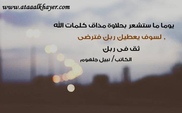 ثق في ربك من:الأخ الأستاذ / نبيل جلهوم عضو جمعية الكُتَّاب ببيت عطاء الخير عضو إتحاد الكتّاب و المثقفين العرب - مصر عضو رابطة أدباء الشام – لندن عضو الإتحاد العالمى للشعراء والمبدعين العرب عضو إتحاد المدربين العرب عضو رابطة الأدب الإسلامى العالمية http://www.ataaalkhayer.com/up/download.php?img=8035 |