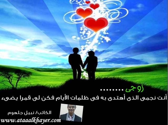 زوجي (4) من:الأخ الأستاذ / نبيل جلهوم عضو جمعية الكُتَّاب ببيت عطاء الخير عضو إتحاد الكتّاب و المثقفين العرب - مصر عضو رابطة أدباء الشام – لندن عضو الإتحاد العالمى للشعراء والمبدعين العرب عضو إتحاد المدربين العرب عضو رابطة الأدب الإسلامى العالمية http://www.ataaalkhayer.com/up/download.php?img=8160 |